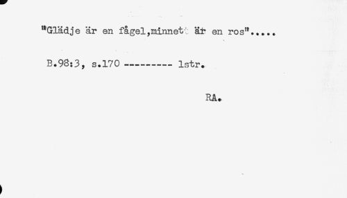 //// "Glädje är en fågel ^minnet ; är en ros"..... //// B.98:3, s.170---lstr. //// RA. ////