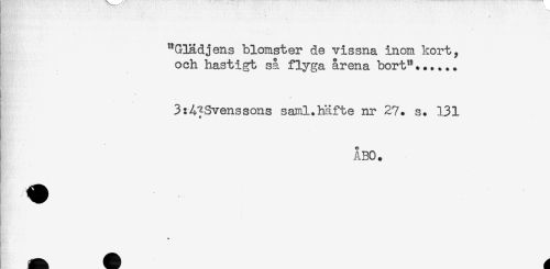 //// "GTRdjens blomster de vissna inom kort, //// och hastigt så flyga årena bort"...... //// 3: ^Svenssons saml.häfte nr 27. s. 131 //// n //// t". //// ÅBO. //// % ////