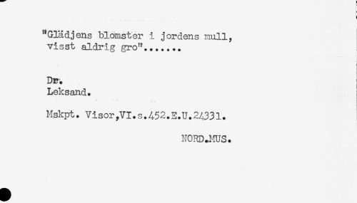 //// "Glädjens blomster i jordens mull, //// visst aldrig gro"....... //// ! //// < //// Leksand. //// * * . . //// Mskpt. Visor ,VI.s.452.E.U.24331. //// NORDJ-fUS. ////