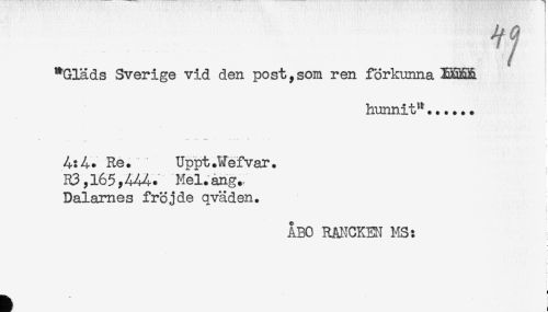 //// **Gläds Sverige vid den post,som ren förkunna BSHA //// hunnit^...... //// . - . .. ^ . //// 4:4. Re. Uppt.Wefvar. //// R3,165,444. Kel.ang. //// Dalames fröjde qväden. //// t //// ÅBO RANCKEN MS; //// : ////