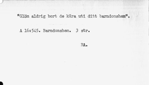 //// "Glöm aldrig bort de kära uti ditt barndomshem". //// A 16:545. Barndomshem. 3 str. //// RA. ////