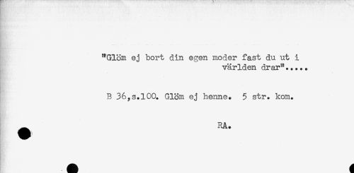 //// "Glöm ej bort din egen moder fast du ut i //// världen drar"..... //// B 36,s.lOO. Glöm ej henne. 5 str. kom. //// - RA. ////