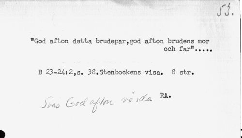//// J J, - //// "God afton detta brudepar,god afton brudens mor //// och far"..... //// B 23-2^:2,s. 38.Stenbockens visa. 8 str. //// t //// ) //// ) //// i ////