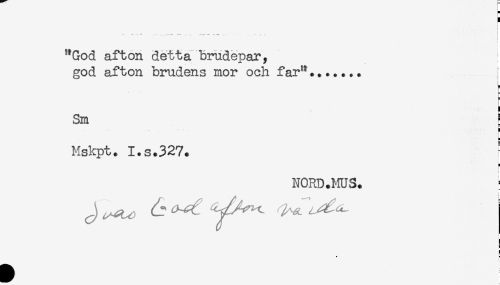 //// ... //// "God afton detta brudepar, //// god afton brudens mor och far"....... //// < //// ! //// Sm ^ //// i //// Mskpt. I.s.327. //// NORD.MUS. //// ! //// i //// ! ////