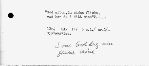 //// ^ ^God afton,du sköna flicka, //// V vad har du i ditt sinn"?..... //// 12:4 SA. INr 6 s.l./ nr.T/. //// Sjömansvisa. ////