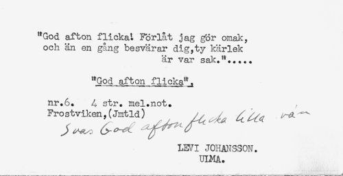 //// "God afton flickat Förlåt jag gör omak, //// och än en gång besvärar dig,ty kärlek //// är var sak."..... //// "God afton flicka", //// nr.6. 4 str. mel.not. , //// Frostviken,(Jmtld) ^^ //// L^I JOHAI-JSSON. //// ULMA. ////