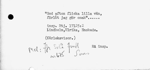 //// "God afton flicka lilla vän, //// ^ förlåt jag gör omak"...... //// [ //// insp. Rtj. 17125:2 //// Lindholm,Ulrika, Enskede. //// (Kärleksvisor.) ////