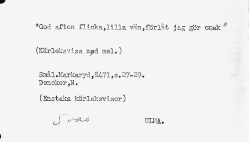 //// "God afton flicka,lilla vän,förlåt jag gör omak ' //// (Kärleksvisa med mel.) //// Smål.Markaryd,8471,s.27-29. //// Dencker ,N. //// (Enstaka kärleksvisor) ////