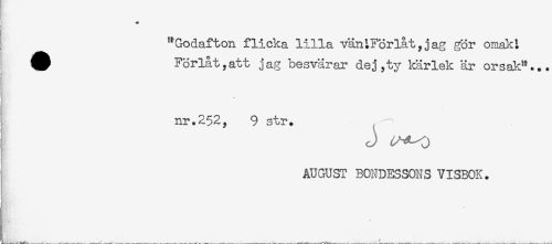 //// J. //// ! //// "Godafton flicka lilla väntFörlåtJag gör omak^ //// ^ Förlåt,att jag besvärar dej,ty kärlek är orsak"... //// nr.252, 9 str. , - //// J //// AUGUST BONDESSONS VISBOK. ////