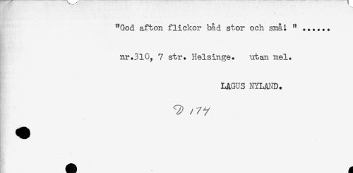 //// **God afton flickor båd stor och små i " ...... //// nr.310, 7 str. Helsinge. utan mel. //// LAGUS NYLAND. ////