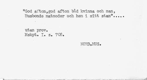 //// "God afton,god afton båd kvinna och man, //// Husbonde matmoder och hem i sitt stan"*..... //// utan prov. //// Hskpt. 1. s. 7C8. //// NOHD.MUS. ////