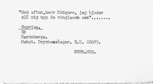 //// "God afton,herr Krogare, jag bjuder //// slå mig upp de vinglasen sex"... //// .Supvisa. //// Sk //// Hardeberga. //// Mskpt. Dryckessånger. E.U. 22689. //// NORD.HUS. ////