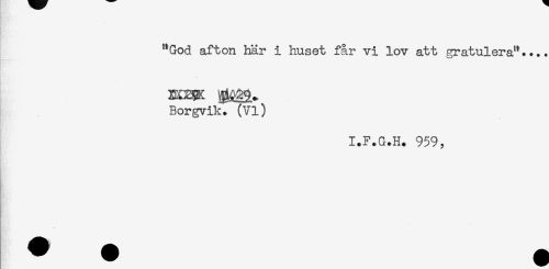 //// "God afton här i huset får vi lov att gratulera".... //// Borgvik. (Vi) //// I.F.G.H. 959, ////