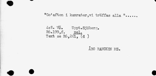 //// "Go'afton i kamrater,vi träffas alla "...... //// 4:8. VC. Uppt.Sjöberg. //// R6.199,f. mel. //// Text se R6,2C[L, (d ) //// ÅBO RAI-ICKEM US. ////