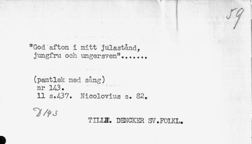 //// "God afton i mitt julastånd, //// jungfru och ungersven"....... //// *..... -<** - , //// (pmitlek med sång) //// nr 143. //// 11 s.437. Nicolovius s. 82^ //// T11,13*. DENGKER SV.FOIZL. ////