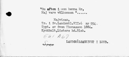 //// "Gu afton i; sora hemma ar, //// ^^ Maj vare välkommen //// Majvisan. //// Tr. i Sv.Landsmål.VII:6 nr55^, //// Uppt. av Sven Ihomasson 188A* //// KyckhultyListers hd.Blek. //// ^ ^ L^SäLSAK^IVET I LUND. ////