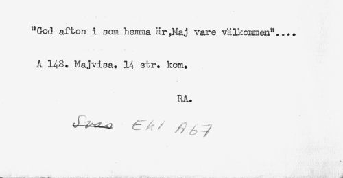 //// "God afton i som hemma är,Maj vare välkommen"... + //// A 148. Maj visa. 14 str. kom. //// RA. //// * //// ___K ////
