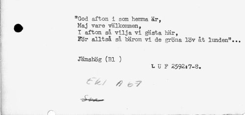 //// "God afton i som hemma är, //// ^^ Maj vare välkommen, //// * I afton så vilja vi gästa här, //// För alltså så bärom vi de gröna löv åt lunden"... //// Jämshög (Bl ) //// t U F 2592:7-8. //// K f ) ...____ . - .. ____ ////