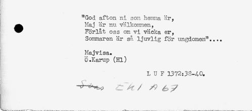 //// "God afton ni son hemma är, //// ^^ Maj är nu välkommen, //// ^^ Förlåt oss om vi väcka er, //// ! Sommaren är så ljuvlig för ungdomen".... //// Majvisa. //// O.Karup (Hl) //// L U F 1372:38-40. ////