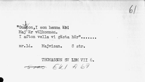 //// "Gn#on,I som hemma ät i //// Maj ^ är välkommen. //// I afton vella vi gästa här"....... //// nr.14. Maj visan. 8 str. //// THOMASSON SY LDM VII 6. ////