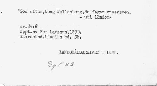 //// "God afton,kung ¥ollenborg,du fager ungersven. //// - uti lomdom- //// nr.89:$ //// Uppt.av Per Larsson, 1S90. //// Snårestad,Ljunits hd. Sk. //// LÅIJDSåLSAni^WET I LUND. ////
