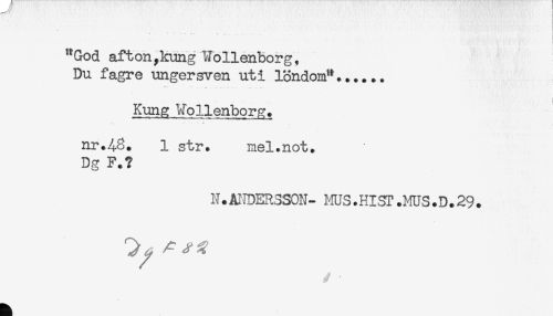 //// "God afton,lmngWollenborg, //// Du fagre ungersven uti löndom"...... //// Kung Wollenborg. //// * //// nr.48. 1 str. mel.not. //// Dg F.? //// N.AIIDER330N- Lms.HI3T.HU3.D.29. ////