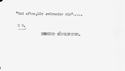 //// "God afton,kär svärmoder min"..... //// D 9. //// DENCKER SÅNGLEKSREG. ////