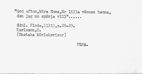 //// "God afton,kära Emma,är lilla vännen hemma, //// den jag nu spörja vill"...... //// Sdml. Flöda,11313,s.28-29. //// Karlsson,G. //// (Enstaka kärleksvisor) //// ULMA. ////