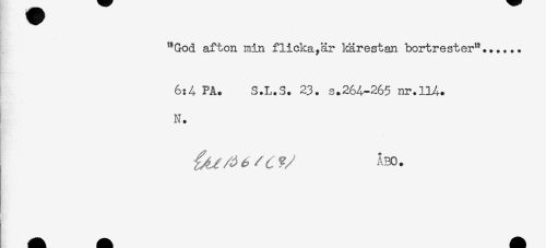 //// "God afton min flicka,är kärestan bortrester"..... //// 6:4 PA. S.L.S. 23. s.264-265 nr.l]^. //// N. //// ÅBO. ////