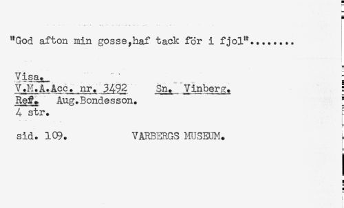 //// F //// * * * ** < ** - ^ .. ** - . //// "God afton min gosse,haf tack för i fjol"... //// Visa. ' ' ; //// V.M.A.Acc. nr. 3492 Sn. Vinberg. ! //// Ref* Ang.Bondesson. ] //// 4 str. ' //// ! //// s //// sid. 109. VAKBERGS MUSEUM. //// g //// H //// I //// i ////