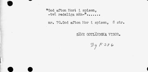 //// "God afton Mort i spisen, //// -två redeliga män-"....... //// nr. 70.God afton Mor i spisen, 8 str. //// g', //// SÄWE GOTLÄNDSKA VISOR. //// t* R* ^ //// j ^^ ////