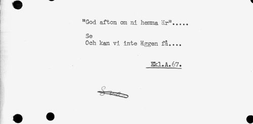 //// "God afton om ni hemma är"..... //// Se //// Och kan vi inte äggen få.... //// Ekl.A.67. //// ' //// g. //// * ////