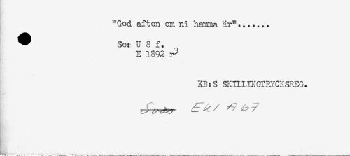//// "God afton om ni hemma är"....... //// ^ Se: U 8 f. //// E 1892 r3 //// KB:S SKILLINGTRYCKSREG. //// * //// ___...... ..._ ^ ^ _ ////