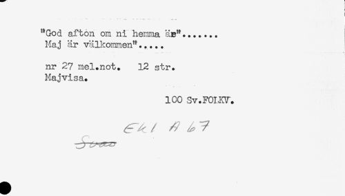 //// - - -, - - - - - - ^ //// ^God afton om ni hemma äp^....... //// Maj är välkommen^..... //// nr 27 mel.not. 12 str. //// Maj vi sa. //// ICO Sv.FOLKV. //// ^ / // ^ 7 ////