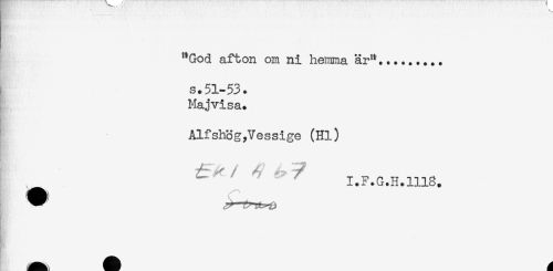 //// * * //// "God afton om ni hemma är".... //// * //// s.51-53. //// Majvisa. //// t. //// /Alfshög,Vessige (Hl) //// ; ^ ^ / //// /I.F.G.H.1118. ////