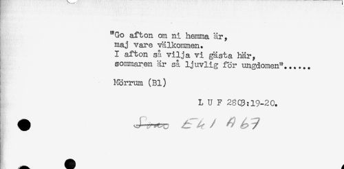 //// "Go afton om ni hemma är, //// maj vare välkommen. //// I afton så vilja vi gästa Mr, //// sommaren är så ljuvlig för ungdomen"...... //// Mörrum (Bl) //// L U F 28(3:19-20. ////
