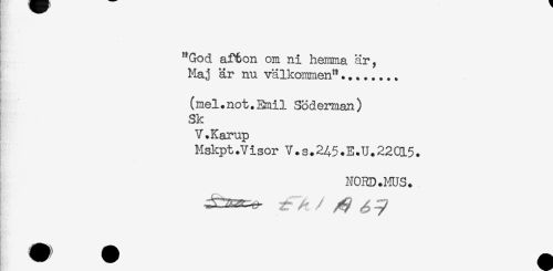 //// ' "God af6on om ni hemma är, //// Maj är nu välkommen"... //// (mel.not.Emil Söderman) //// Sk //// V.Karup //// Mskpt.Visor V.S.245.E.U.22015. //// NORD.MUS. ////