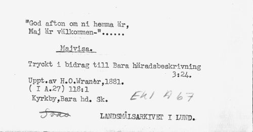 //// "God afton om ni hemma är. //// Haj är välkommen-"...... ! //// t //// ! //// Majvisa. //// Tryckt i bidrag till Bara häradsbeskrivning //// Uppt.av H.0.Wranér,l88l. //// ( I A.27) 118:1 //// Kyrkby, Bar a hd. Sk. - ' ' ^^ 7 //// L^D3L°LSARKr/ET I LUND. ////