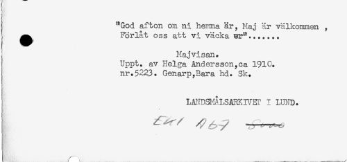 //// } //// ^God afton om ni hemma är, Maj är välkommen , //// f. ^ Förlåt oss att vi väcka er"....... //// . Majvisan. //// Uppt. av Helga Andersson,ca 1910. //// nr.5223. Genarp,Bara hd. Sk. //// *! //// A //// ! LMD^dLSARKIVET I LUIJD. //// zf^r/ ^^ ^^ ////