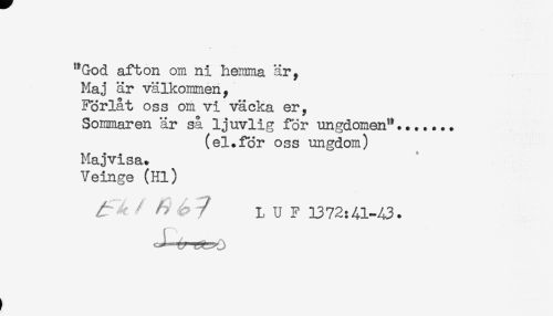 //// "God afton om ni hemma är, //// Maj är välkommen. //// Förlåt oss om vi väcka er, //// Sommaren är så ljuvlig för ungdomen"....... //// (el.för oss ungdom) //// Majvisa. //// Veinge (Hl) //// ^ ^ ' ^ 7 L u F 3372:41-43. ////