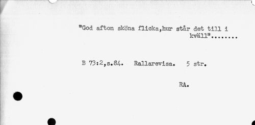 //// "God afton sköna flicka,hur står det till i //// kväll"... //// B 73:2,s.&4. Rallarevisa. 5 str. //// RA. ////