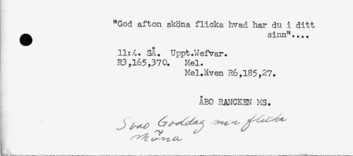 //// "God afton sköna flicka hvad har du i ditt //// ^ sinn".... //// 11:4. SA. Uppt.Nefvar. //// R3,165,370. Mel. //// Mel.även 36,185,27. //// ÅBO RANCKEN MS. //// L . ////