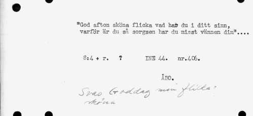 //// "God afton sköna flicka vad ha* du i ditt sinn, //// varför är du sa sorgsen har du misst vännen din". //// * //// 8:4 + r. ? INE nr.406. //// ÅBO. //// * ////