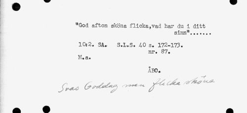 //// "God afton skona flicka,vad har du i ditt //// sinn"....... //// 10:2. SA. S.L.S. A0 s. 172-173. //// nr. 87. //// M.a. //// ÅBO. ////