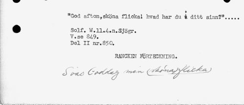 //// $ //// "God aftonysköna flicka! hvad har du ih, ditt sinn?^.. //// . //// ^ Solf. W.ll.^.n.Sjogr. //// V.se 849. //// Del II nr. 85 C. //// RANCKB-I ^RTECKNING. //// L____ ////