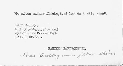 //// i //// ! //// < //// "Go afton skoner flicka,hvad har du i ditt sinn". //// j //// Rept.Wollgr. //// Died //// dyl.fr. Solf.v.se 849. //// Del.II nr.851. //// . RANCK3N ^RTECmjING. ////
