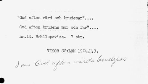 //// i //// i //// '*God afton värd och brudepar".... //// *.... , ... -...... i //// . //// God afton brudens mor och far".... //// ** * '- -- . //// nr.12. Bröllopsvisa. 7 str. //// - //// h //// t //// VISOR SV:LDM 19%.H.3. ////