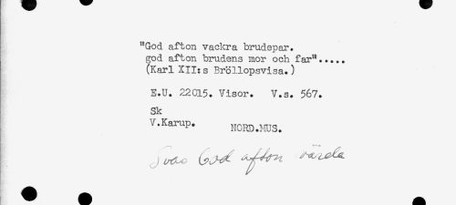//// "God afton vackra brudepar. //// god afton brudens mor och far"..... //// (Karl XII:s Bröllopsvisa.) //// E.U. 22015. Visor. V.s. 567. //// Sk //// V.Karup. NORD.MUS. //// __. f-^at ////