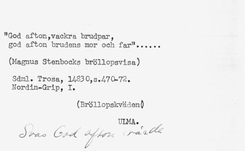 //// "God afton,vackra brudpar, //// god afton brudens mor och far"...... //// (Magnus Stenbocks bröllopsvisa) //// Sdml. Trosa, 14830,3.470-72. //// Nordin-Grip, 1. //// (BröllopskvädenO //// ULMÅ. ////