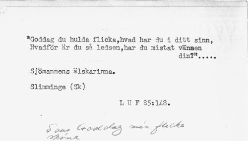 //// i //// ! //// .. . . //// "Goddag du hulda flicka,hvad har du i ditt sinn, //// Hvadför är du så ledsen,har du mistat vänaen //// din?"..... //// Sjömannens älskarinna. //// Slimminge (Sk) //// L U F S5:1A8. ////